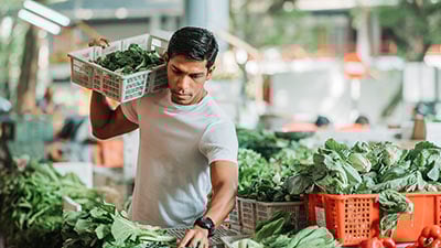 Smiling, casual man with beard, working with pencil, paper and laptop