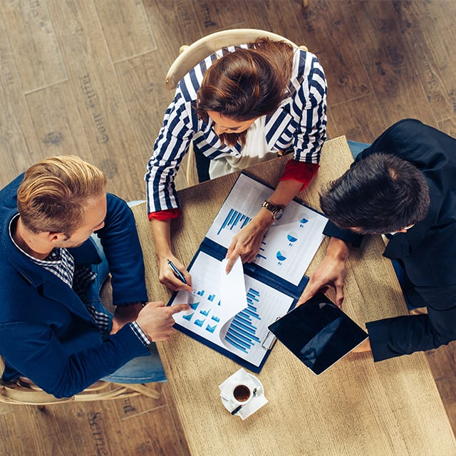 Overhead view of employees at a table with laptops, coffee mugs, notebooks, and paper spread out.