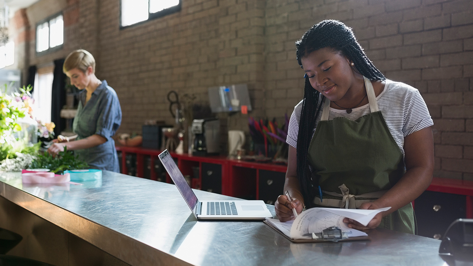 Woman offering Visa card at counter.