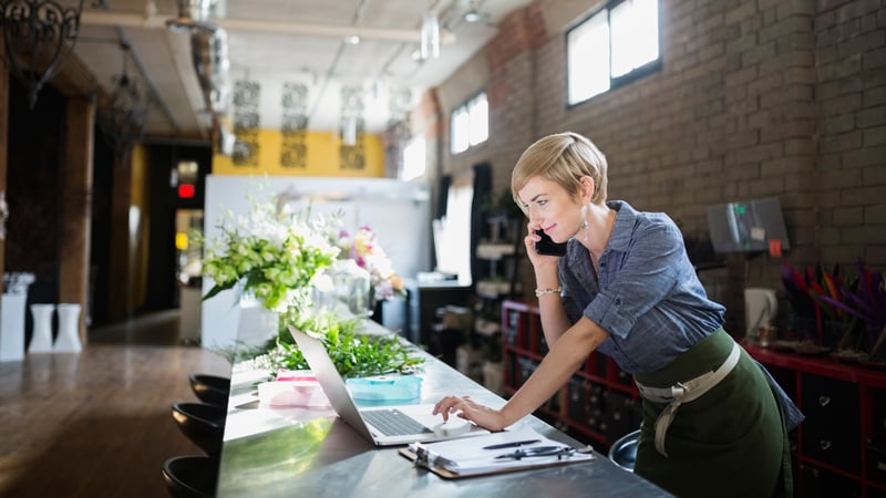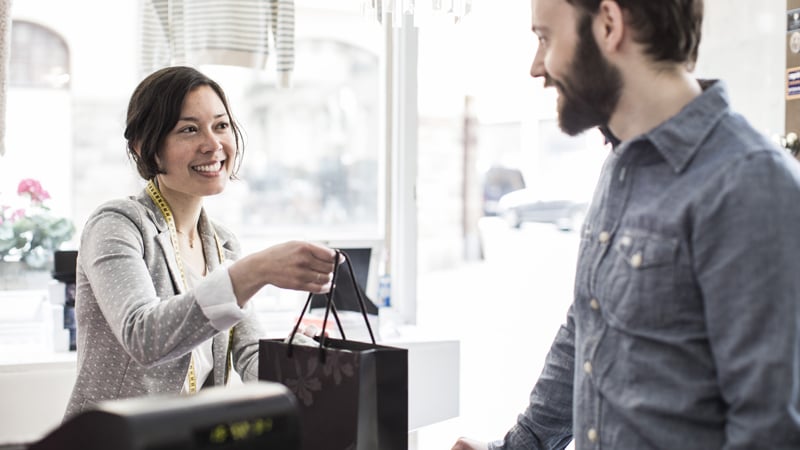 Female design professional giving a shopping bag to customer at cash counter in a studio space.