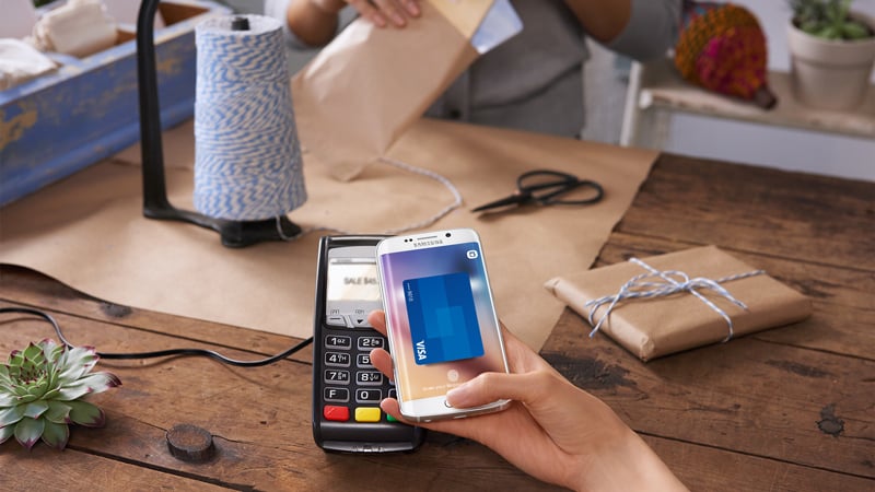 Closeup of a POS system in a coffee shop displaying the Tap to Pay logo.