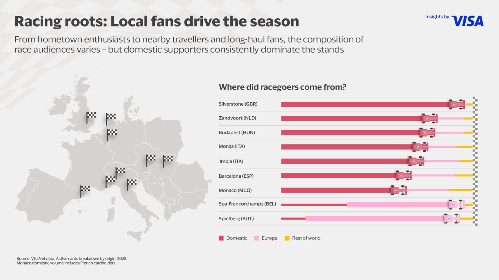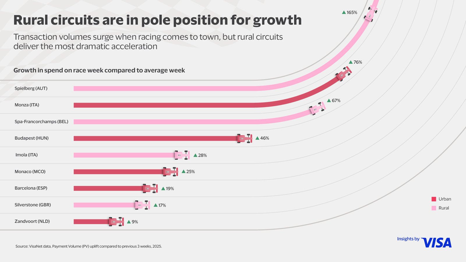 All insights and data provided are based on VisaNet data for transactions within a 15km-radius from the race location for race week (Monday to Sunday, incl. race weekend) vs the previous 3-week average (2-week for Hungary) for the 2025 season.