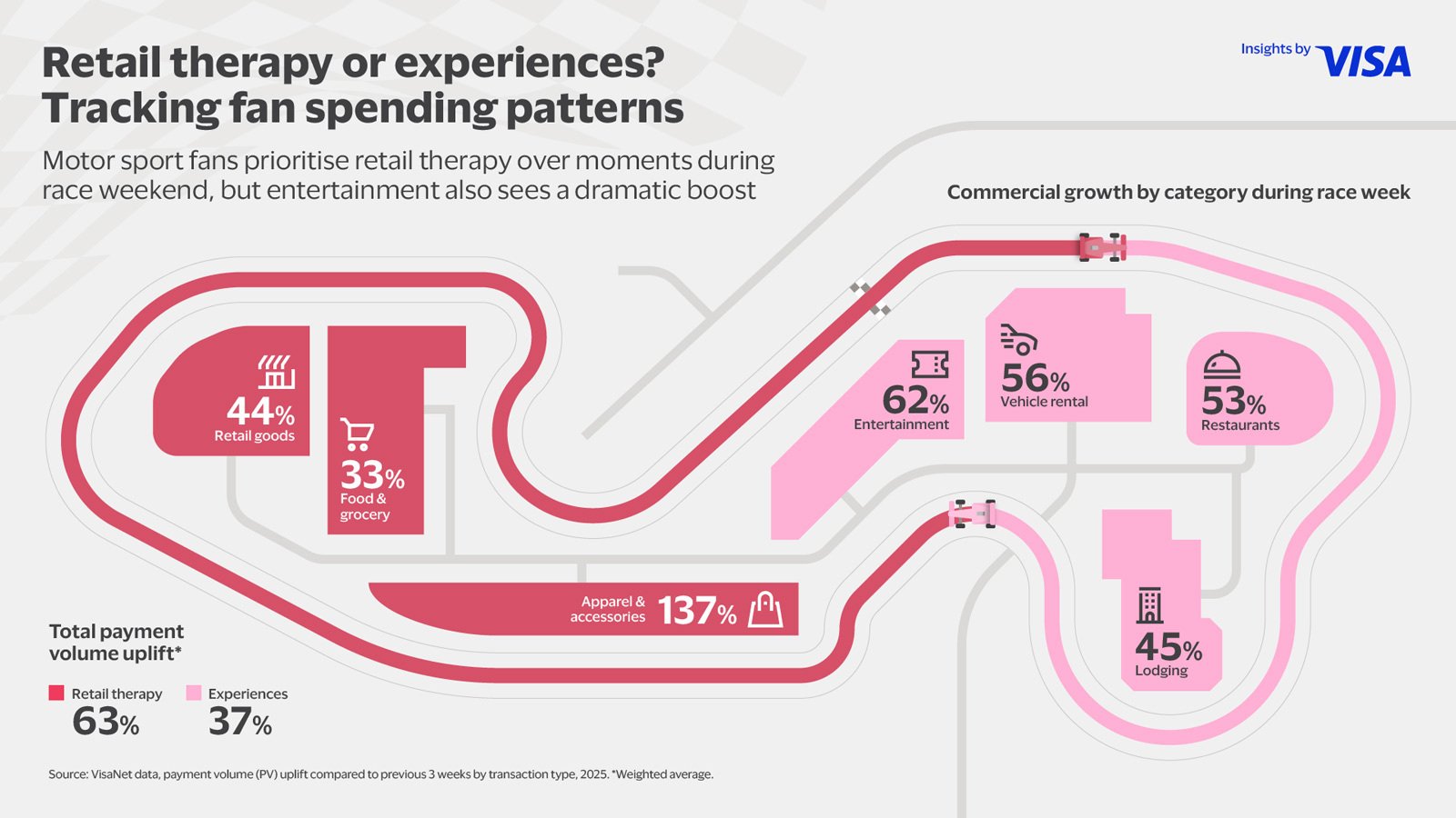 While motor racing has long been celebrated for its speed, spectacle, and passion, Visa’s analysis over the past three years uncovers a more interesting story. Each race weekend brings a surge in local demand – from premium stays to everyday experiences – showing how sport can shift spending patterns and accelerate spend in unexpected ways.