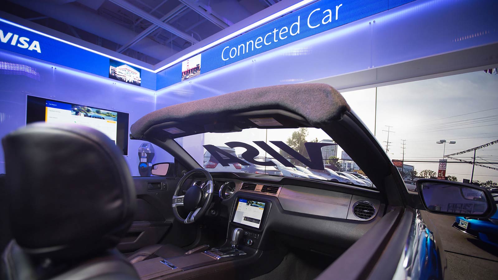 San Francisco Market Street trolley drives by the office building of Visa One Market office.